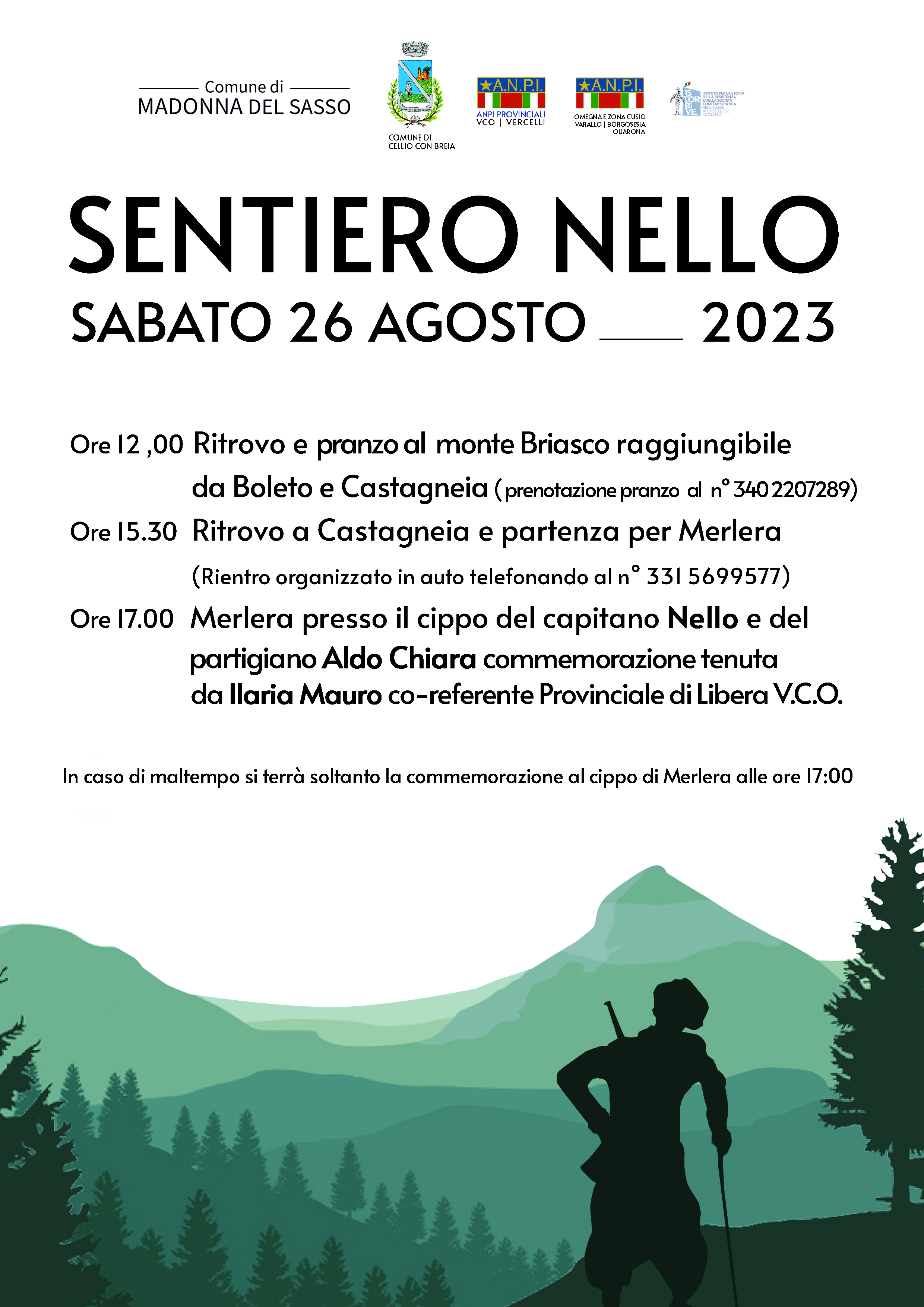 ore 17.00 Merlera presso il cippo del Capitano Nello e del Partigiano Aldo Chiara commemorazione tenuta da Ilaria Mauro co-referente provinciale di Libera V.C.O.